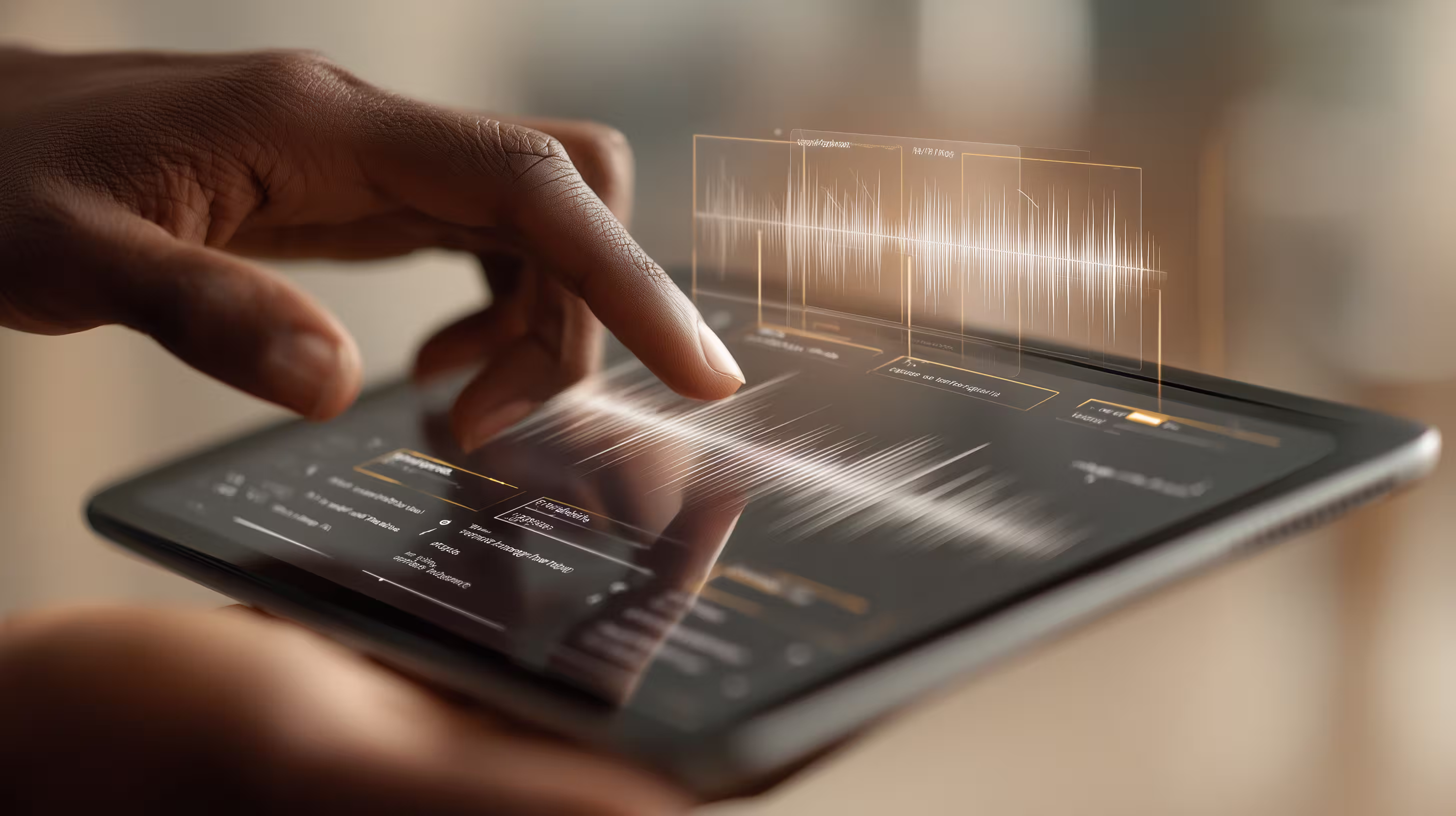 [Image: A person interacting with a tablet using multiple input modes simultaneously — one hand touching the screen, a small sound wave visualization near their mouth indicating voice input, and subtle gesture-tracking lines around their other hand. The screen shows a clean AI chat interface blended with visual data cards. Warm neutral background, modern and human — not sci-fi. Feels real, not conceptual.]