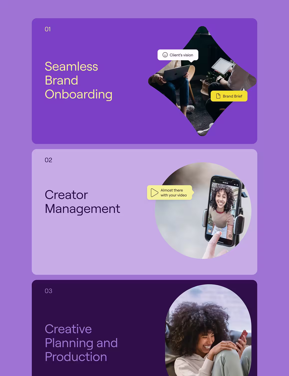 We built a bold, high-energy brand identity that celebrates the spirit of user-generated content. Inspired by the raw, real, and fast-moving nature of social video, the new brand combines a vibrant color palette, expressive typography, and subtle motion elements to stand out in a crowded SaaS landscape. The redesigned logo nods to content creation with a playful, selfie-stick-inspired twist—while the overall system is flexible enough to scale across campaigns, the platform UI, and social.The result? A brand that feels just as creative as the users powering the product—and just as polished as the brands using it.